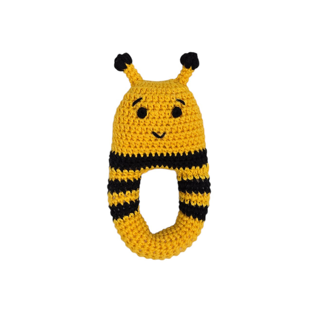 KO1037Bring a buzz of joy to playtime with this hand-crocheted bumblebee baby rattle. Soft to the touch and perfectly sized for little hands, this cheerful bee is crafted with bright yellow and black stripes, a smiling face, and sweet antennae that make it irresistibly cute. The lightweight ring shape makes gripping easy for babies, while the gentle rattle sound stimulates their senses and encourages early motor skills.