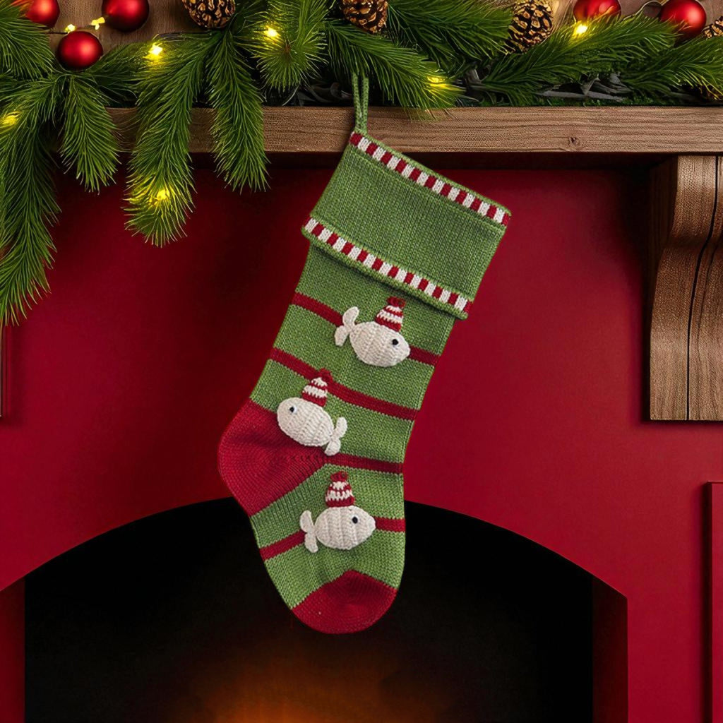 Green, smooth cuff stocking with hand-embroidered fish wearing Christmas caps, and thin red stripes and heel. Purrrrrfect for the cat in your life.